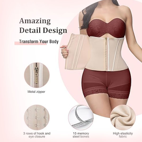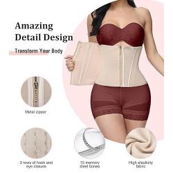 Our tight fitting corset waist trainer features precise wiring technology, making the zipper and hook eye buckle less prone to folding, and the full edge design makes the built-in steel bones less likely to be exposed. ......Read More